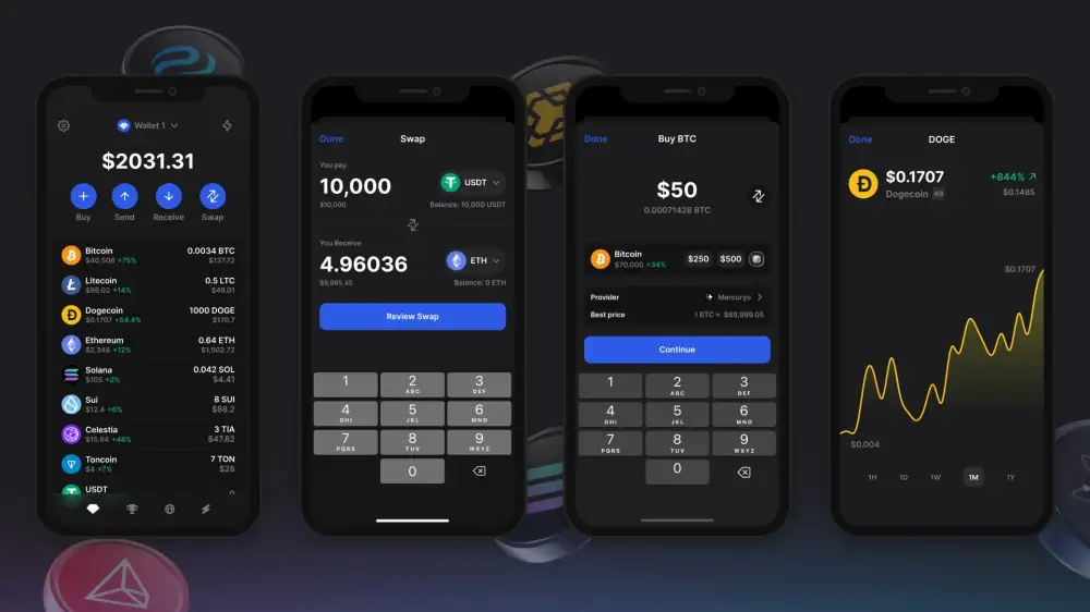 Výčet funkcí je na bezplatnou peněženku překvapivě bohatý. Staking ETH, SOL a dalších kryptoměn přímo v aplikaci. Decentralizované swapy přes DEX agregátor bez KYC a za nejlepší ceny na trhu. Push notifikace na příchozí transakce i cenové pohyby. Sledování portfolia s grafy v reálném čase. WalletConnect pro připojení k dApps. A chytrá ochrana proti spam transakcím (dust protection).